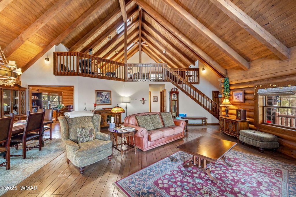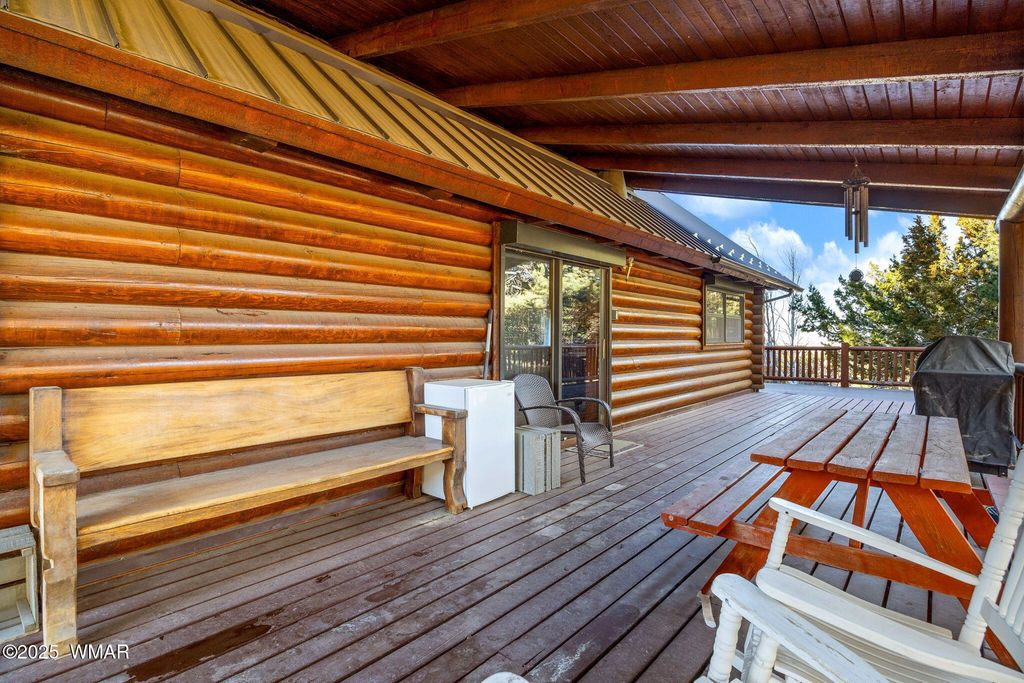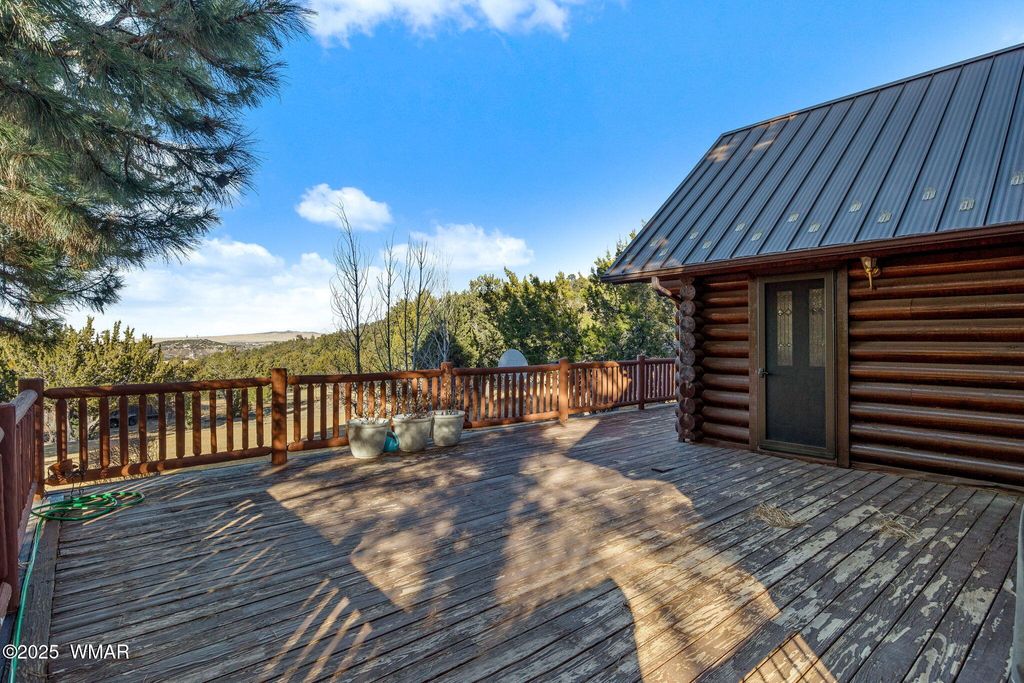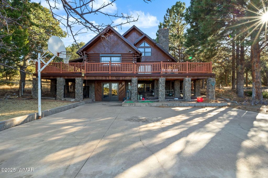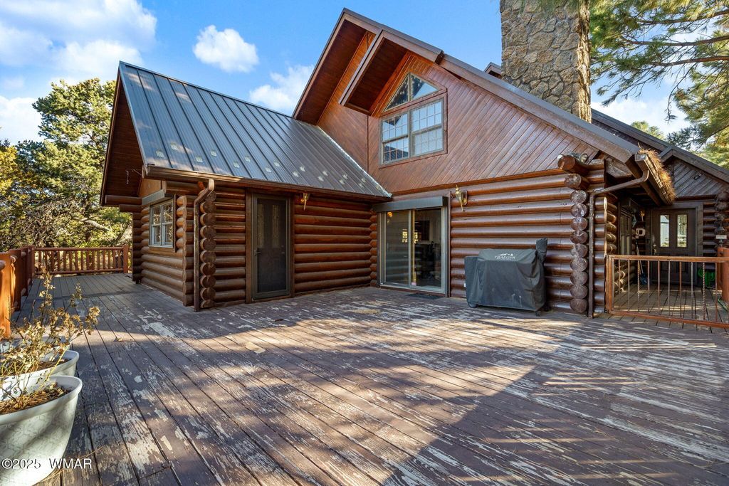 room or home gym, plus a large walk-out storage area. Set on 3.32 acres and surrounded by towering pines, the property offers plenty of space to enjoy the cool White Mountain air. Multiple decks and porches surround the home, perfect for relaxing or