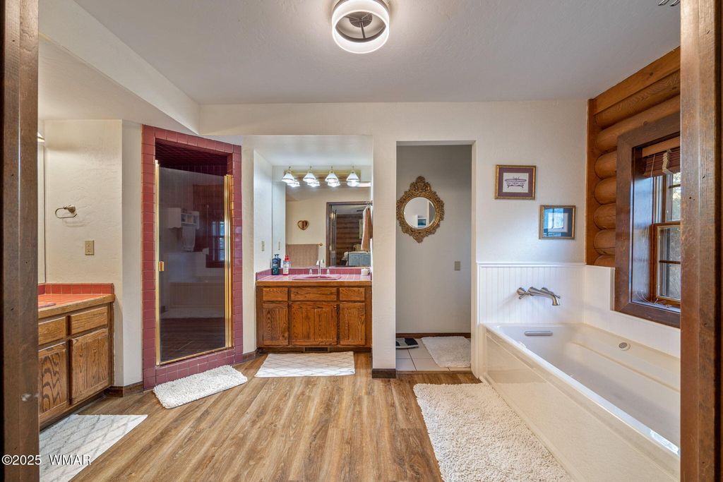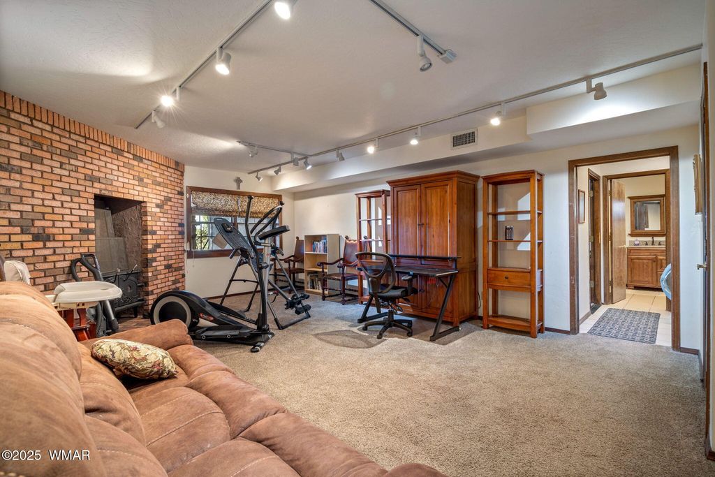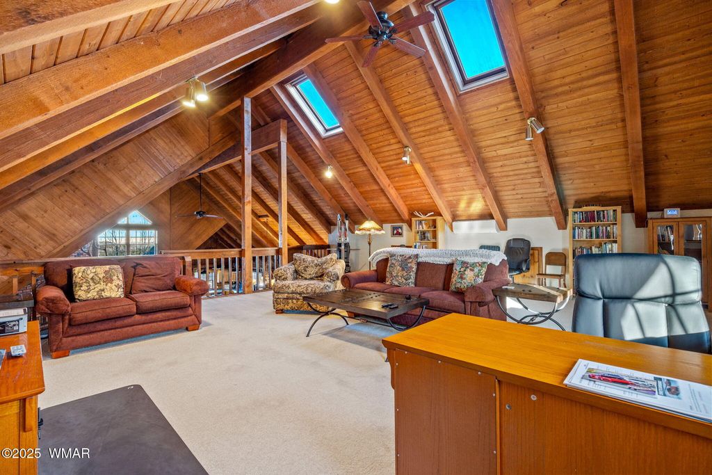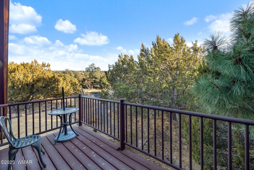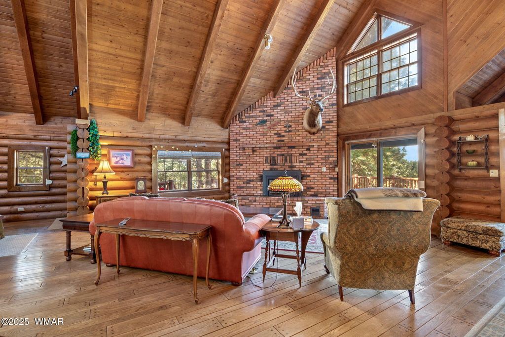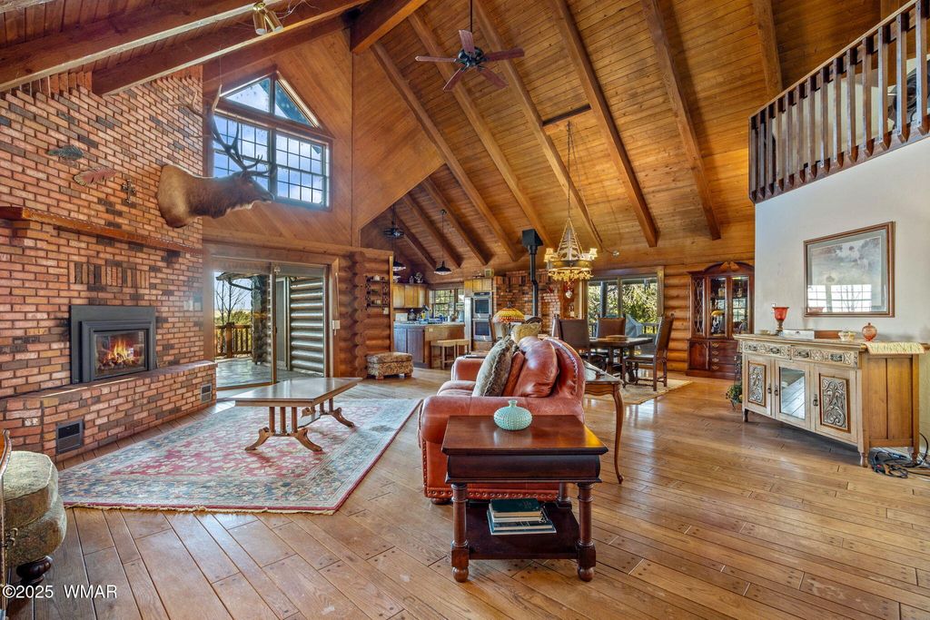 room or home gym, plus a large walk-out storage area. Set on 3.32 acres and surrounded by towering pines, the property offers plenty of space to enjoy the cool White Mountain air. Multiple decks and porches surround the home, perfect for relaxing or