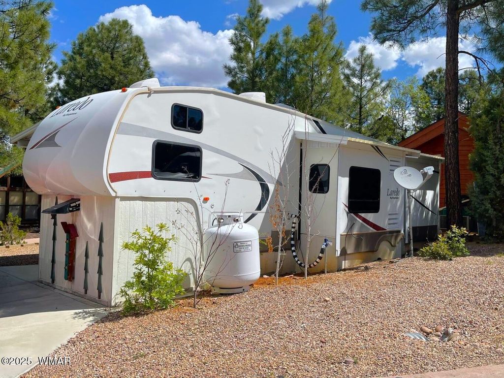 Super Cute! 2 Bed, 1 bath 32 ft home in White Mountain Vacation Village on a corner lot. Beautifully landscaped with a covered patio, BBQ, and even a shed that could be converted to have a washer/dryer, be a workshop, or just leave for additional storage. There is central vacuuming to help you keep tidy, NEW PLUMBING, and the Shower even has a neat tub feature for the littles or fur-babies, or maybe even YOU. 🙂