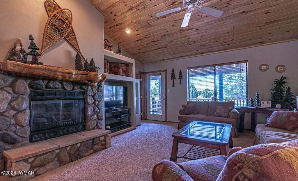 Welcome to your mountain getaway in the White Mountains! This charming fully furnished 2-bedroom, 2-bath cabin captures everything you love about high-country living; featuring warm tongue-and-groove aspen ceilings, a cozy stone fireplace with log mantle, and that classic cabin feel throughout. Step outside and relax on the covered front and/or back decks, perfect for morning coffee or evening sunsets among while soaking in the cool crisp mountain air. This home comes furnished, so you can start enjoying cabin life right away. Whether you're looking for a weekend retreat or a year-round escape, this one checks all the boxes for comfort, style, and mountain charm! This neighborhood does allow for short term rentals.