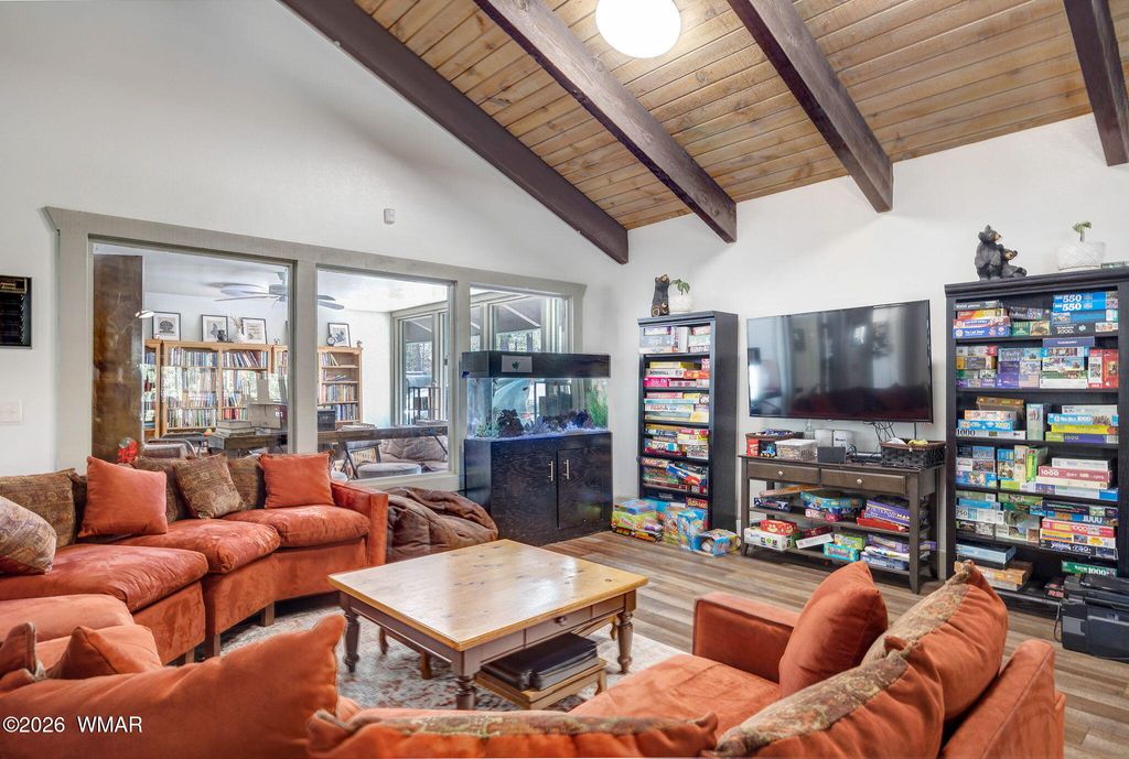 Charming and cozy cabin-style townhome nestled in the highly sought-after Pinetop Country Club community, surrounded by towering pines. This classic older unit has been updated to include some modern touches while preserving its cozy character"”perfect for those seeking their mountain home. Step inside to the vaulted ceiling great room featuring a beautiful gas fireplace as the centerpiece, ideal for chilly evenings after a day on the golf course or hiking nearby trails. Recent remodeling includes updated flooring with luxury vinyl plank in the main living area. Refreshed kitchen elements - stainless steel appliances and NEW cabinetry with soft close doors. The one car garage offers storage that not all units have. The advantage of having a place to keep skiis and sleds out of your way plus providing security for your vehicle or golf cart is a definite plus! Both bathrooms allow for shared use from guests. Making it so all visitors have equal access. The extra office/tv room off the covered porch has been enveloped in rich, rustic cedar plank offering a warm and inviting texture where family can enjoy a game, puzzle or movie.The loft upstairs has been filled with bunkbeds to provide additional sleeping accommodations for family members. This unit has so much to offer and is being sold furnished.