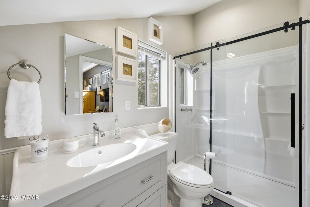 The open-concept main level offers 600 square feet of living space including a cozy living area warmed by a pellet stove, a farmhouse-style kitchen with butcher block counters, gas range, and open shelving, plus an eat-in dining space, all bathed in natural light from oversized windows framing forest views Ascend the open staircase to find a generous 300-square-foot loft bedroom with vaulted ceilings, soothing blue accent walls, clerestory windows, and an en-suite bathroom featuring a modern glass-enclosed shower. A convenient half bath on the main level serves guests.