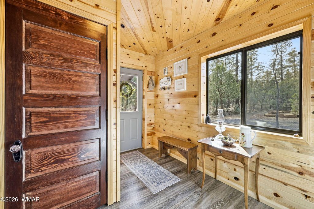 Step through the cheerful red door into a warm, inviting interior featuring gorgeous knotty pine walls and ceilings, exposed painted beams, and wide-plank vinyl flooring throughout.