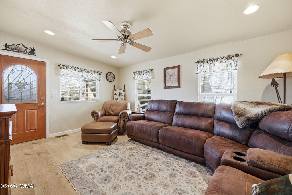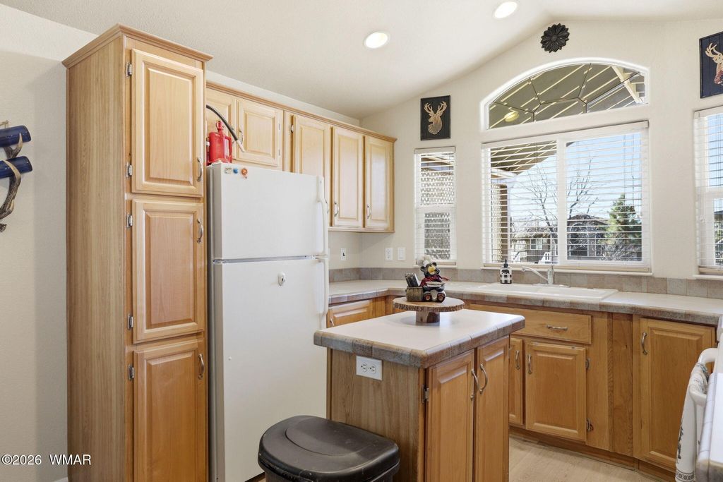 Step inside to a bright front kitchen featuring abundant natural light, a stunning beveled glass window, spacious island, pantry, and eat-in dining area - perfect for morning coffee or entertaining guests. The inviting living area showcases an electric fireplace and attractive vaulted ceilings. Adding warmth and character throughout.