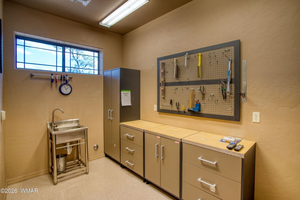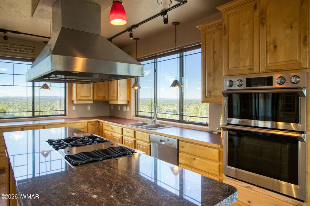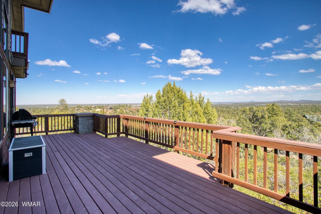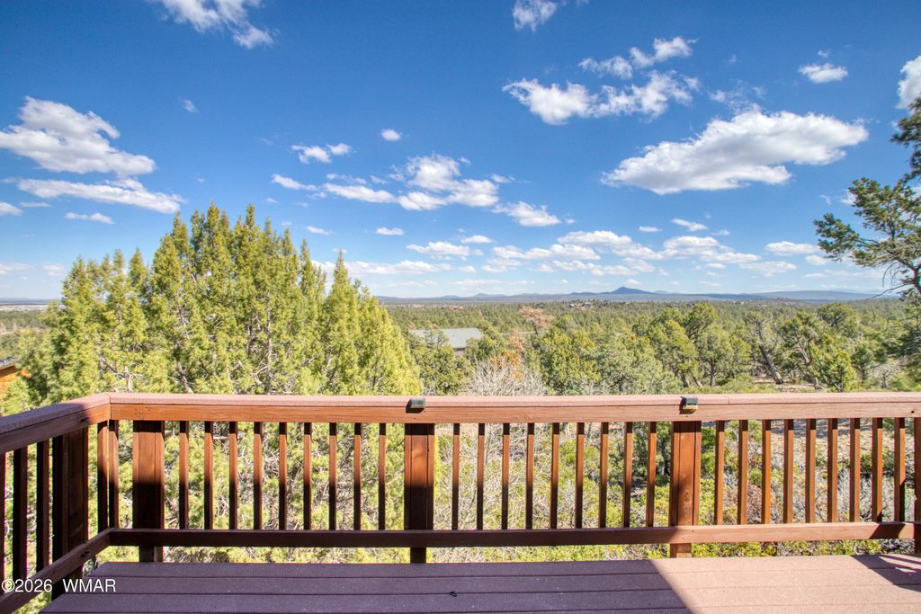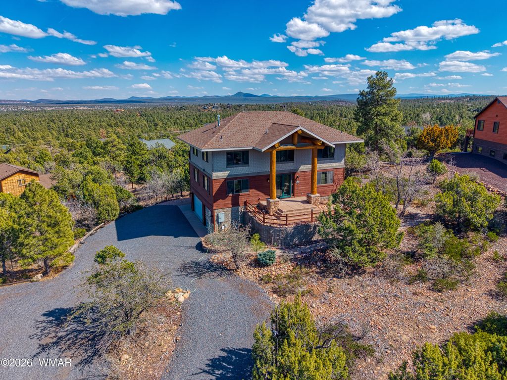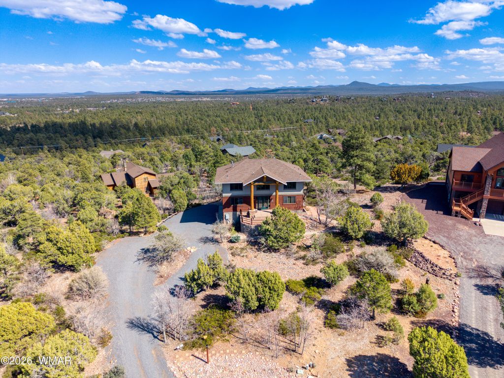 VIEWS, VIEWS & MORE VIEWS - The High Point of Show Low Perched at the top of Show Low, this architect-designed custom home captures some of the most breathtaking panoramic views in the White Mountains. On crisp winter days, you can see all the way to the San Francisco Peaks in Flagstaff. To the north, enjoy sweeping views of the forest, the town of Show Low, and even the wind turbines beyond Snowflake. From the expansive back deck, take in stunning vistas of Porter Mountain, Mount Baldy, Blue Peak, and surrounding White Mountain ranges. Designed with three levels to maximize the scenery, this thoughtfully crafted home blends comfort, craftsmanship, and functionality. MAIN LEVEL The main floor features an open-concept kitchen with custom maple cabinetry, a 10-foot granite island, perfect for entertaining or everyday cooking. A new LG combination oven/microwave includes a dividable oven that allows for three separate baking temperatures at once. Two cabinet-depth French-door refrigerators sit side-by-side, offering exceptional storage space. The kitchen and dining area flow into a dramatic great room with soaring 20-foot ceilings, walls of glass, and a stunning elk antler chandelier. A stone fireplace with gas logs and thermostat control is crowned by a massive juniper log mantel and framed by custom built-in maple bookshelves. Also on this level is a spacious study/den featuring a second stone fireplace with a juniper mantel, creating a warm and inviting retreat. The two-story entry foyer welcomes guests with a beautiful whitetail antler chandelier, celebrating the deer and elk that frequent the 1.11-acre property. A stylish powder room completes the main level with a custom Michael Hays vessel sink, granite countertop, Antelope Ranch lighting fixture, and David Marsh mirror. UPPER LEVEL Upstairs are three bedrooms with spectacular views, plus a full guest bath featuring a Jacuzzi soaking tub. The primary suite is positioned for privacy and comfort and includes a Vermont Castings wood stove with gas logs and thermostat, perfect for cozy mountain evenings. The ensuite bath offers a two-person Jacuzzi whirlpool tub with built-in heater, glass-enclosed shower, dual vanities, a private toilet room, and a spacious walk-in closet. The entire upper floor and staircase feature new carpet with premium padding, while both bathrooms showcase new wood flooring with waterproof polymer backing. A conveniently located laundry closet with Maytag stacked washer and dryer sits just outside the primary suite. LOWER LEVEL The walk-out lower level includes a three-car garage with extensive shelving, along with a large living or recreation room and a fourth bedroom with its own half bath and oversized walk-in closet with built-in cabinetry. An additional flex room offers excellent potential as a workshop, hobby space, or kitchenette for a future mother-in-law suite. It already includes cabinetry, a stainless-steel sink, and multiple power outlets, with plumbing roughed-in to expand the bedroom bath with a shower if desired. The home has two full baths and 2 half baths ( half baths could be converted to full. Additional Features This home is equipped with numerous thoughtful upgrades including: Rinnai on-demand tankless water heater with circulation system, controllable via smartphone Hybrid water softener with whole-house charcoal filtration system Lightning protection system installed by a Lightning Institute of America-certified company Whole-house surge protector Hardwired monitored security system with smoke/heat detection and cellular dial-out Gas hookup on the back deck for a barbecue Unforgettable Setting On the Fourth of July, this home becomes one of the best vantage points in town for the Show Low fireworks show. Skip the crowds and enjoy the celebration from your own elevated deck with family and friends while taking in the incredible panoramic scenery. A truly one-of-a-kind mountain property combining stunning views