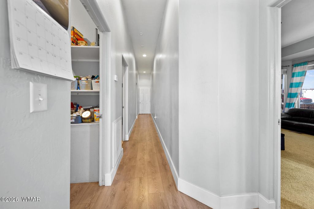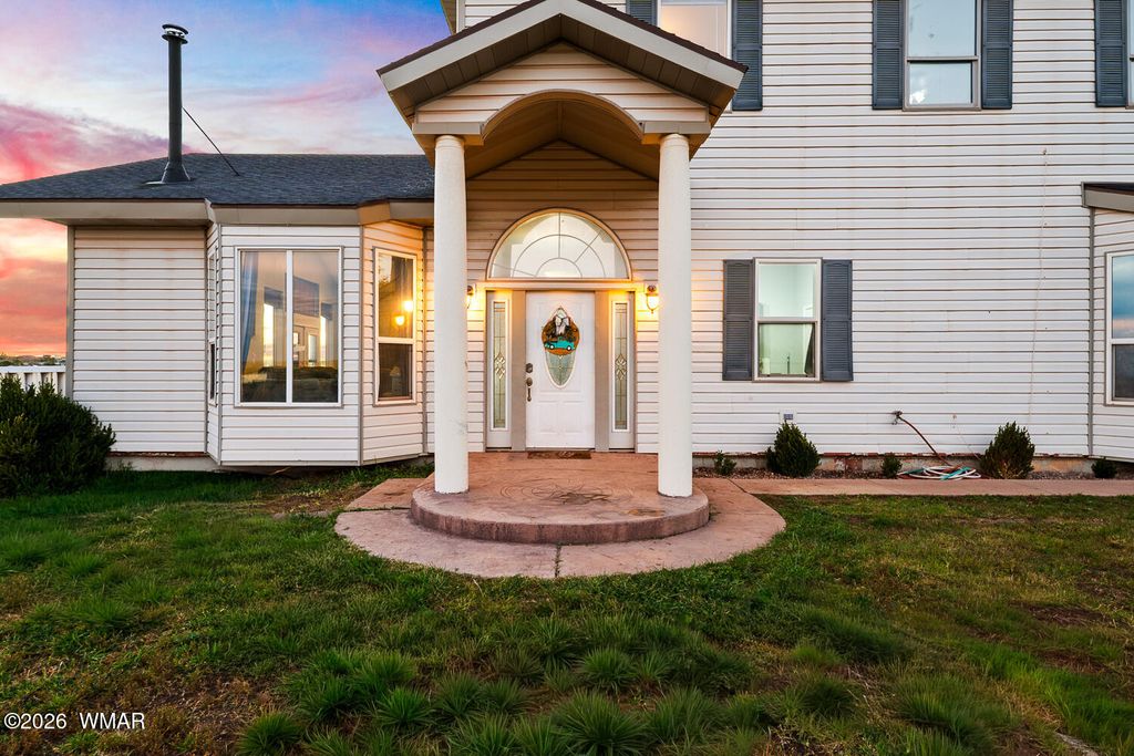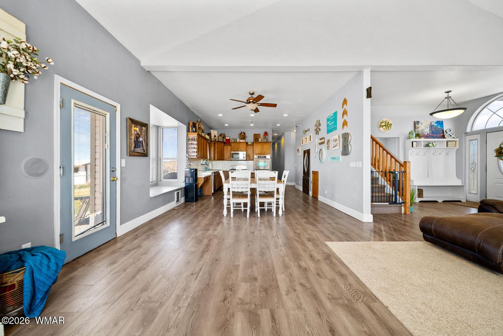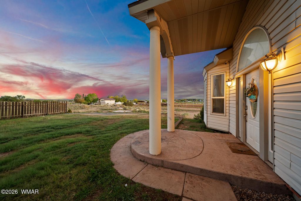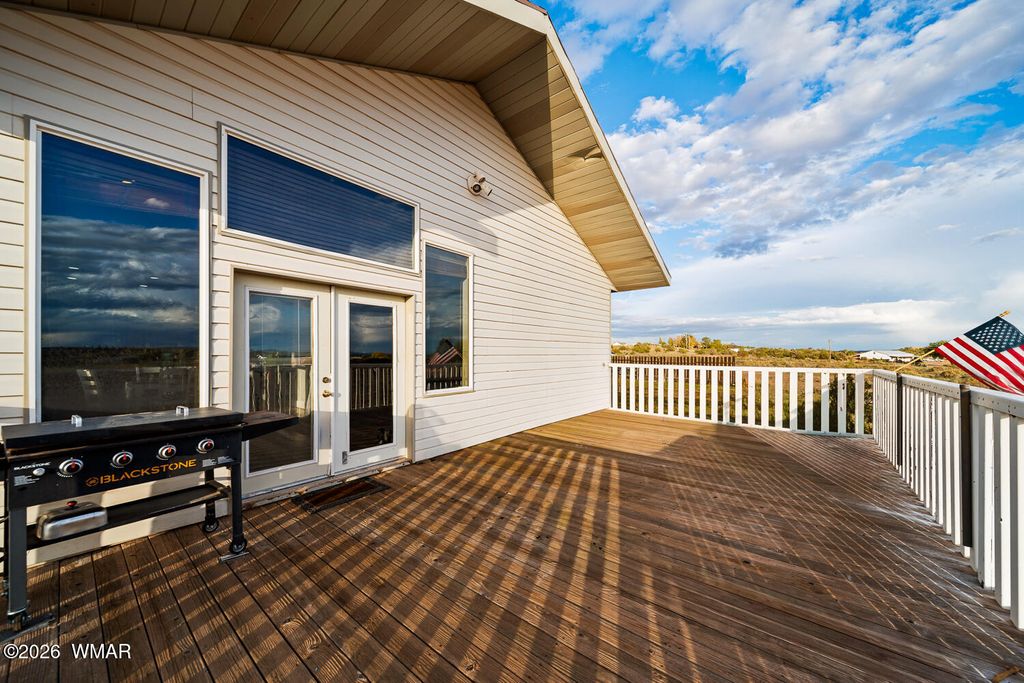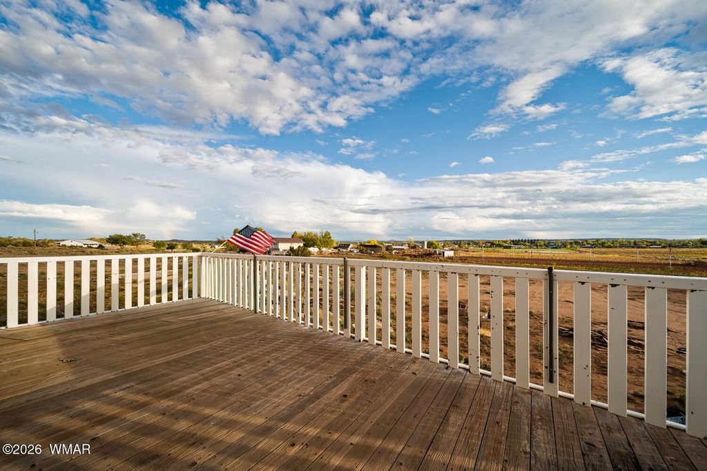 The kitchen is thoughtfully designed with stainless steel appliances and opens seamlessly to the main living areas with vaulted ceilings, making it perfect for everyday living or gathering with friends and family. Downstairs, the primary suite offers a cozy bay window sitting area, along with a truly one of a kind feature, a hidden artillery room that adds both character and a sense of intrigue. Step outside and you will find one of the most special parts of this property. The expansive deck offers sweeping views that feel endless, the perfect place to sip your morning coffee, watch the monsoon storms roll in, or take in those breathtaking sunset evenings. The fenced yard adds both functionality and peace of mind, offering space for pets, play, or simply enjoying the outdoors.