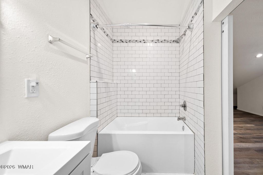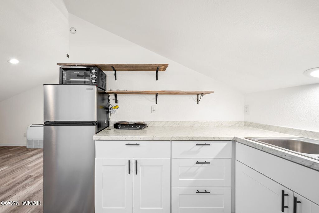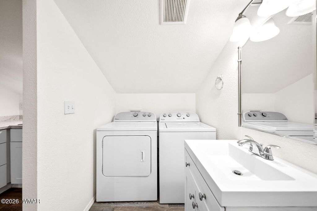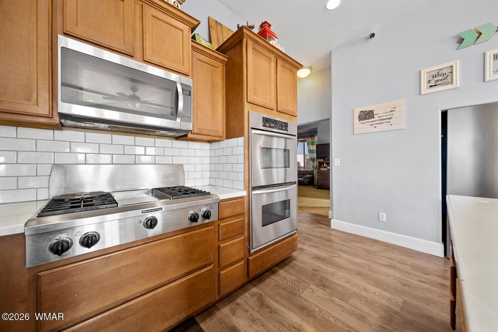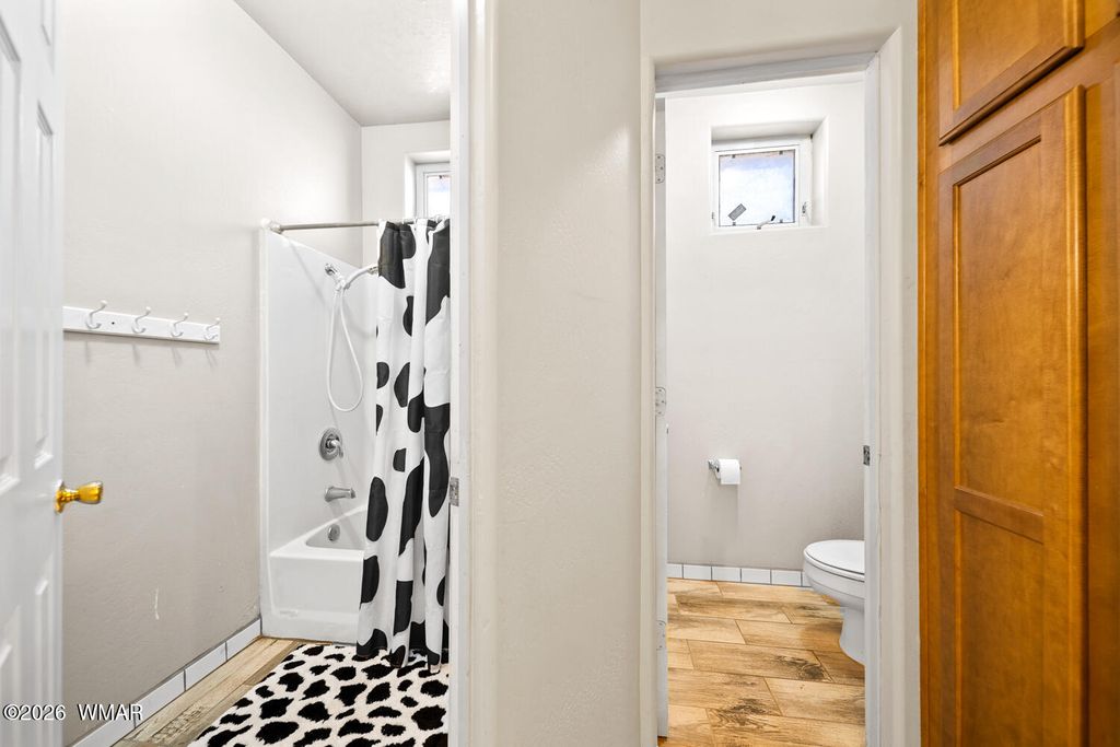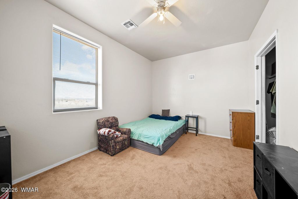 The kitchen is thoughtfully designed with stainless steel appliances and opens seamlessly to the main living areas with vaulted ceilings, making it perfect for everyday living or gathering with friends and family. Downstairs, the primary suite offers a cozy bay window sitting area, along with a truly one of a kind feature, a hidden artillery room that adds both character and a sense of intrigue. Step outside and you will find one of the most special parts of this property. The expansive deck offers sweeping views that feel endless, the perfect place to sip your morning coffee, watch the monsoon storms roll in, or take in those breathtaking sunset evenings. The fenced yard adds both functionality and peace of mind, offering space for pets, play, or simply enjoying the outdoors.
