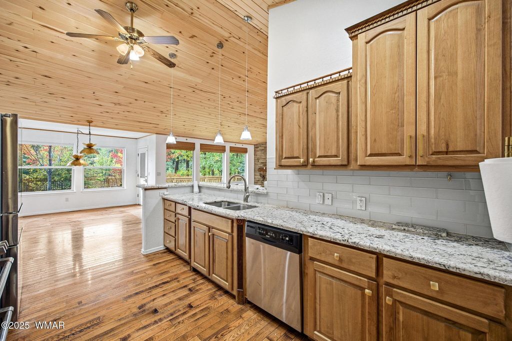 This home is absolutely beautiful! The owners have spared no expense in upgrading the appliances with an amazing new electric range, gorgeous fridge, they even put a mini split in the 2-car garage to allow for it to be used as a workshop during the snowy months! Brand new pellet stove fireplace insert that heats the home beautifully! This is the best spot to have a home in the pines! Beautiful open living space with vaulted ceilings and large windows to let in so much natural light!