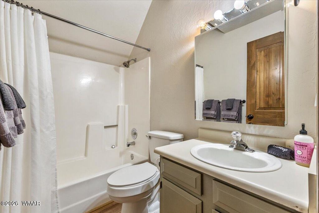 Great VRBO/Airbnb opportunity! This authentic log cabin tucked in the tall pines offers the perfect mountain getaway or investment property. Enjoy relaxing on the covered front deck or the private balcony off the upstairs master suite. The loft area with office setup overlooks the cozy living space below, creating a true cabin-in-the-woods feel. Features include hardwood flooring in the living room and kitchen, cabinets with pull-out drawers, updated vinyl flooring throughout, and newer interior wood doors. Additional highlights include air conditioning and a new porch railing. The home comes fully furnished for a turnkey experience. The property is fully fenced and includes membership to the Pinetop Lakes Recreation