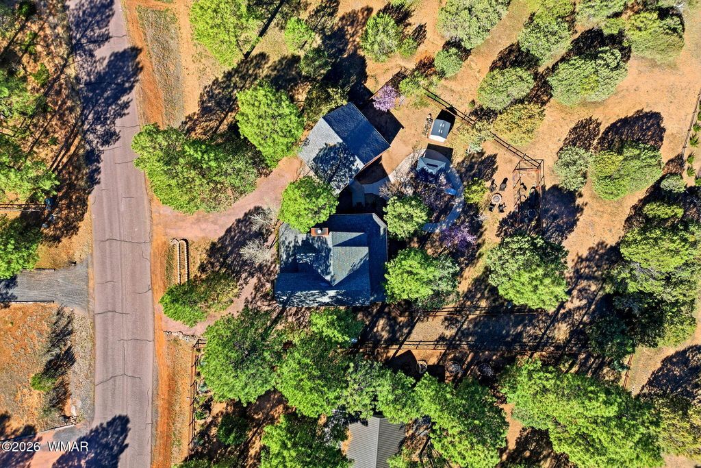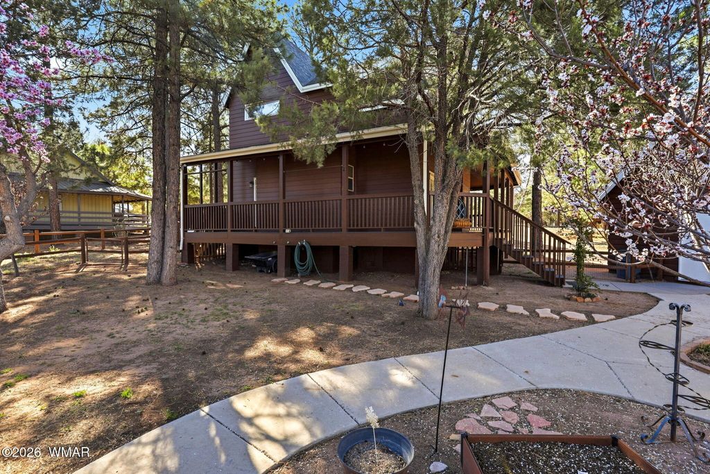 Charming mountain home nestled among the tall pines in the desirable Forest Trails area of Overgaard. Situated on a beautifully treed oversized lot of nearly 3/4 acre, this 3 bedroom, 2 and a half bathroom home also includes a versatile den. The spacious living room features a cozy wood-burning fireplace, perfect for cool mountain evenings. Enjoy the outdoors from the wrap-around covered deck overlooking the peaceful yard and garden area. The property also includes a detached two-car garage with a loft/den above, ideal for a hobby room, office, or extra storage. Perfect as a full-time home, vacation getaway, or investment property in Arizona's White Mountains.