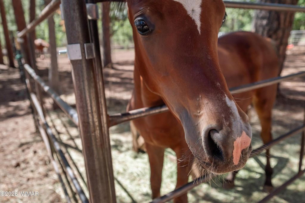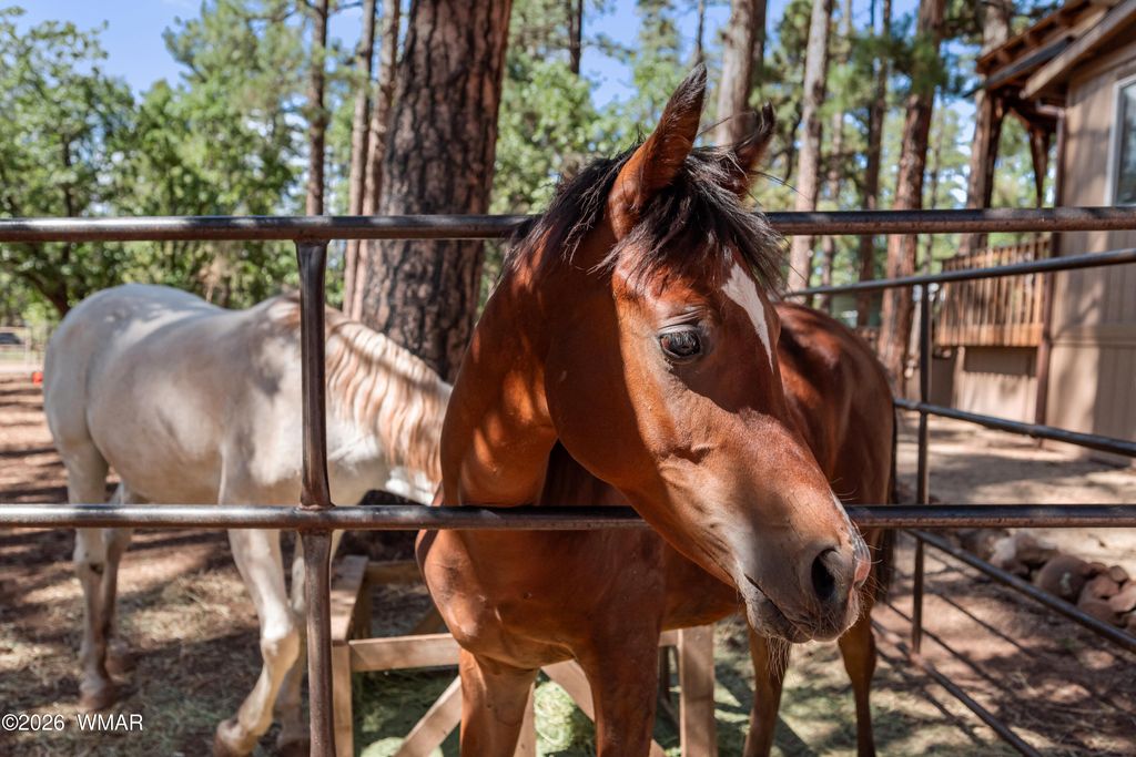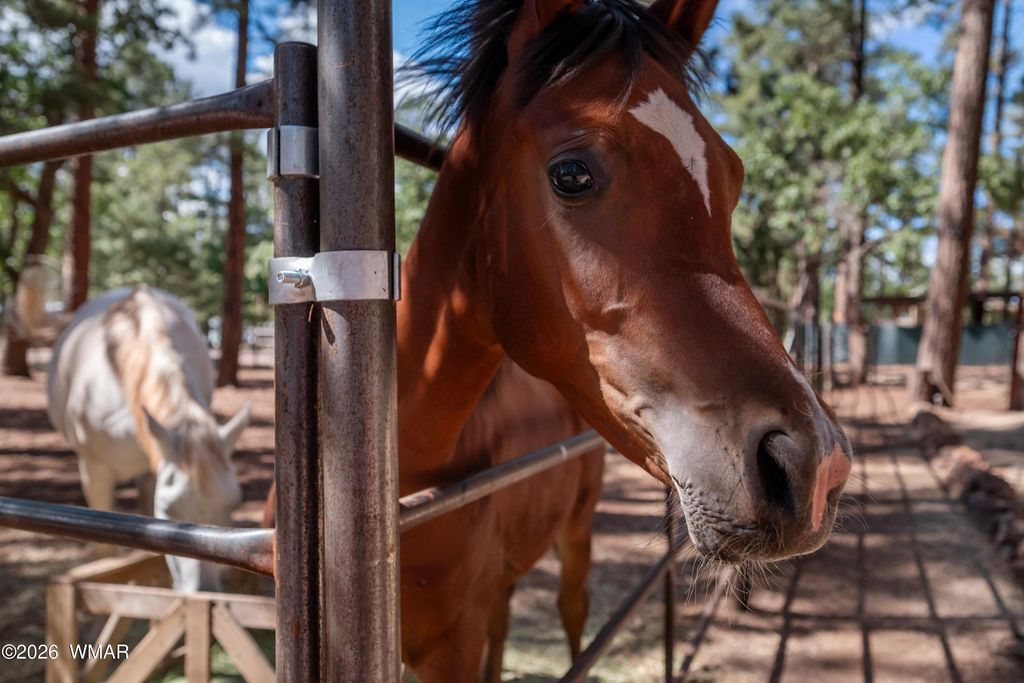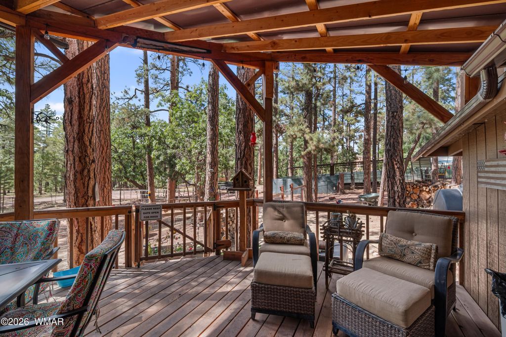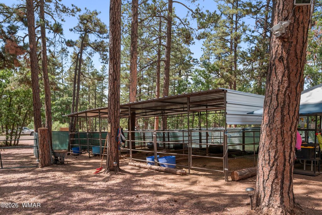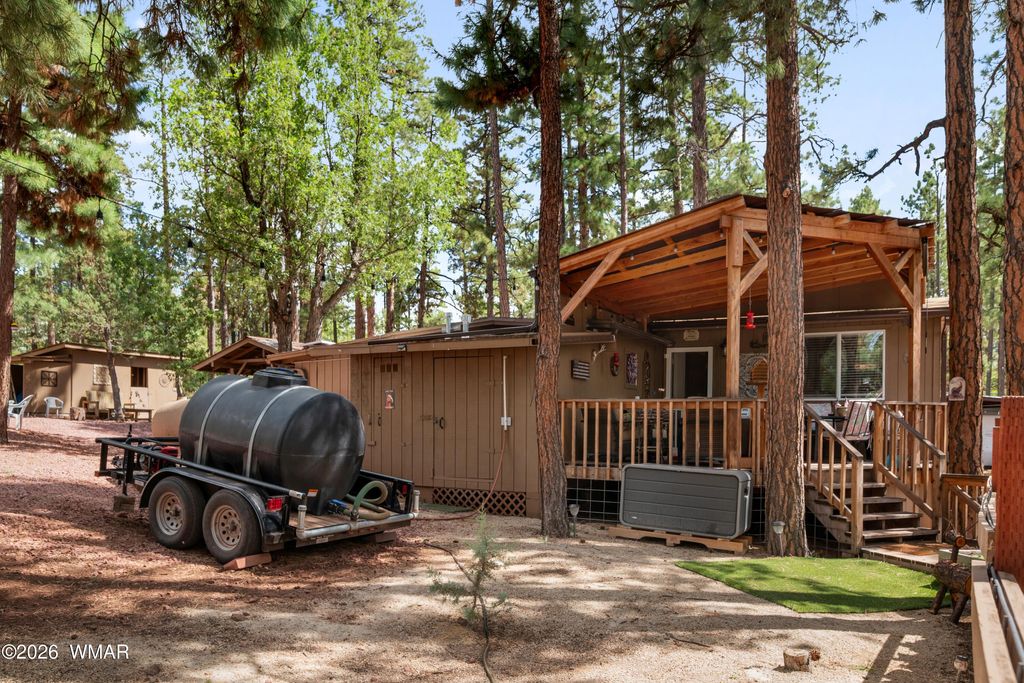 THIS IS THE PLACE YOU'VE BEEN LOOKING FOR TO GETAWAY AND ESCAPE THE HEAT AND BUSY LIFE STYLE. This amazing off the grid but not off the grid has a lot to offer. This cozy cabin is a great weekend home, full time home or even a VRBO, home has been partially updated and comes furnished ready to use. Property is a beautifully treed acre with a lot of amenities including horse corrals and stalls, large connex, 2 metal RV canopies (RVs not included), tuff shed, wood shed, storage shed, and even a cute shed used for a bunkhouse. There is 2 bdrms/ 1 bath inside, and even a 1/2 bath for your RV guests to use outside. NEW solar panels and batteries, as well as the prior solar system which could be used for other purposes, SMALL water hauling is included (not large one). Great front and back patio as well as a firepit area for entertaining. Too much to list all the great things this home offers, don't miss a chance to make it yours. Bring your horses it is already set up for them. You are just minutes away from the forest whether you are walking, horse back riding, bicycling or driving a UTV, you will love the easy access. Community well for hauling unlimited water is $300/year after new membership buy in.