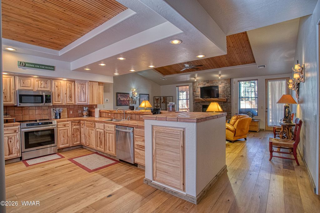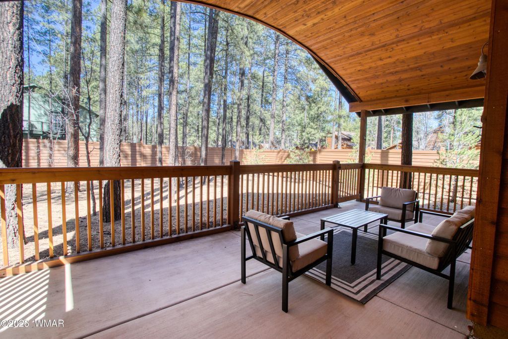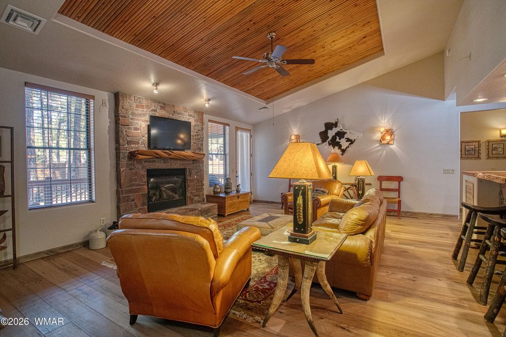 Beautifully appointed and thoughtfully upgraded, this home offers a warm and inviting mountain retreat. From the tongue-and-groove vaulted ceilings and flowing hardwood floors to the stunning stone gas fireplace, every detail creates a sense of comfort and charm. Surrounded by tall pines, the private yard enhances the peaceful setting. Offered fully furnished with tasteful décor and quality amenities, the spacious great room flows seamlessly into a bright, open kitchen featuring a custom breakfast bar, stainless steel appliances, and a new induction range/oven--perfect for both everyday living and entertaining. The primary suite is a true retreat, complete with a newly remodeled walk-in shower, updated countertops, and a generous walk-in closet. Step outside to the large covered back deck, an ideal space to relax and take in the fresh mountain air. A true dream home with upgrades throughout--move-in ready and designed for effortless mountain living. Life in Pinetop is all about embracing a peaceful mountain lifestyle surrounded by towering pines, crisp fresh air, and the beauty of all four seasons at a comfortable elevation of around 7,200 feet. This quiet, community offers the perfect balance of privacy and connection, with a warm, welcoming atmosphere that makes it ideal for both full-time living and second homes. Days here are naturally centered around the outdoors--whether it's a morning on the golf course, afternoons spent exploring scenic hiking and biking trails, or weekends enjoying nearby lakes for fishing and kayaking. In the winter months, snow-dusted landscapes open the door to nearby skiing and cozy mountain living at its finest. Beyond the natural beauty, convenience is never far away. The nearby communities of Pinetop-Lakeside and Show Low offer a variety of local shops, dining, and everyday essentials, making it easy to enjoy both tranquility and accessibility. With its cooler climate providing a refreshing escape from the desert heat, Pinetop offers a lifestyle that feels relaxed, rejuvenating, and deeply connected to nature--perfect for those who crave both serenity and adventure.