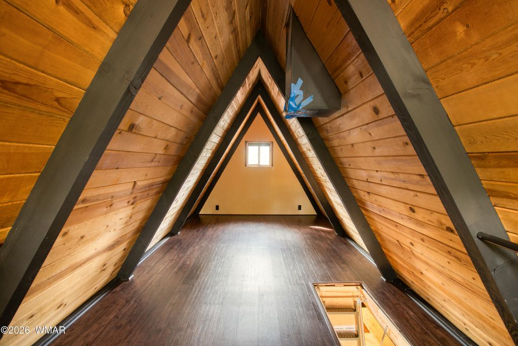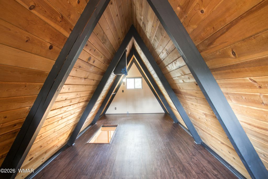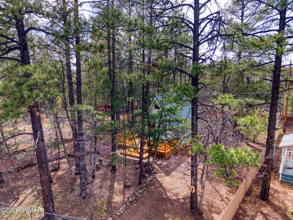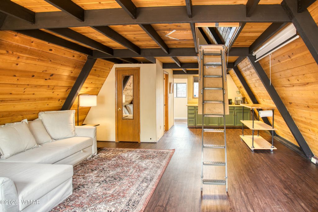Charming remodeled A-frame cabin in Pinetop offering the perfect escape from the heat. This one-bedroom, one-bath home features an upstairs bedroom with an open and comfortable living area below, ideal for year-round use or a seasonal getaway from the valley. The interior has been thoughtfully updated with new flooring, a refreshed bathroom, and a cozy pellet stove that adds both warmth and character. The laundry room features a new all-in-one washer and dryer combo along with ample storage for added functionality. Step outside to enjoy a newly built approximately 12 x 20 deck, creating great additional outdoor living space. Situated on a larger gated lot, the property offers ample parking and flexibility for side-by-sides, outdoor toys, or even an RV, all in a private setting with no HOA.