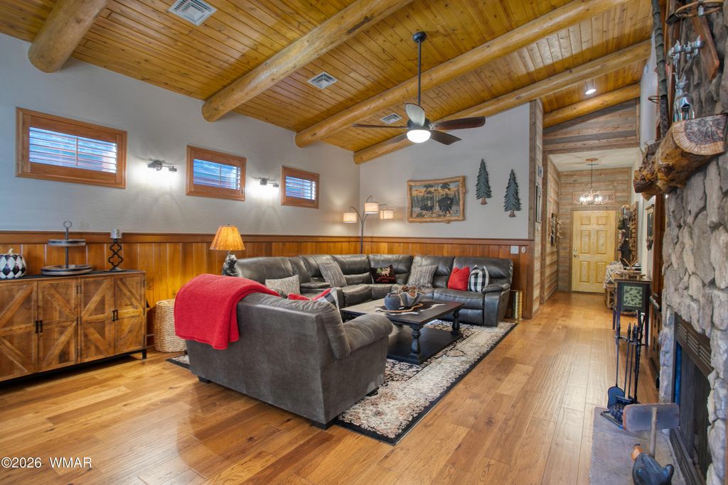 Pinetop Crossing. One of the most beautiful homes in most desirable gated Pinetop Crossing. One level! 3 bedrooms, 2 baths, 2 car garage. In the past few years owner has done an extensive remodel including hardwood flooring, wood ceiling, kitchen, fireplace stone, appliances, copper sinks, backsplash, hot water heater (w/ recirculating system, shutters, wood wall treatments. Exterior has been stained. HOA covers roof, irrigation, yard maintenance, outdoor plumbing. Interior lot. Rarely do we see a home w/ so much thought and maintenance. Furniture is available. This is truly turn key.