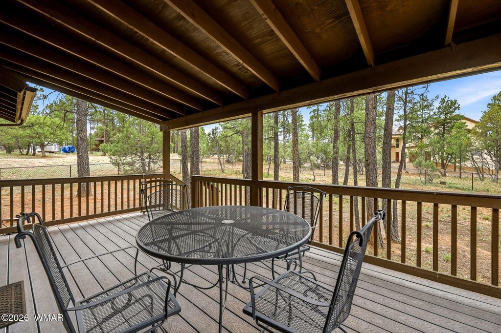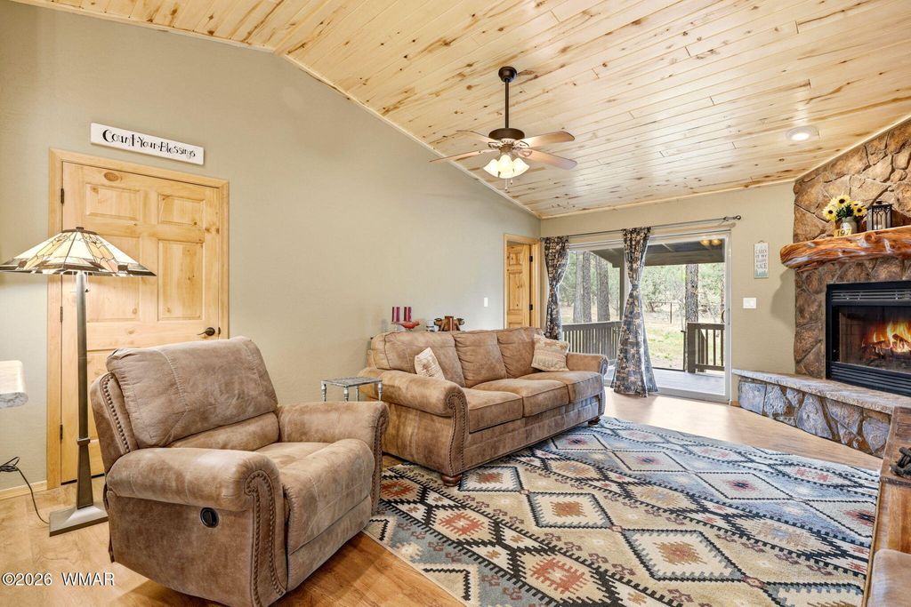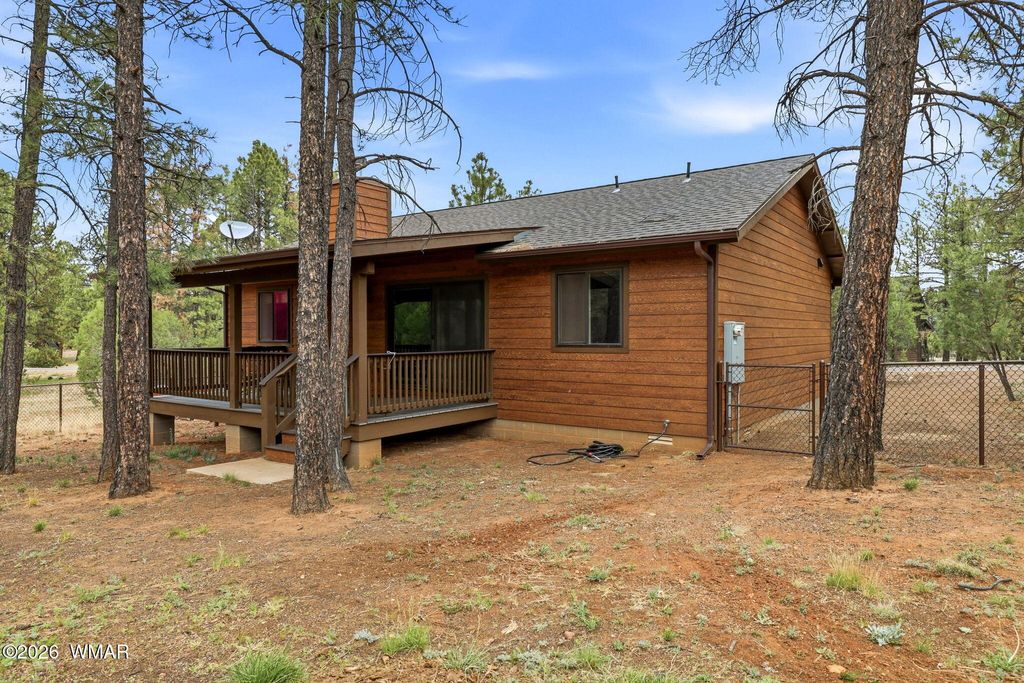 This one owner cabin has been meticulously maintained and is truly move-in ready. and features low-maintenance siding & decking, making upkeep simple and stress-free. Enjoy the peaceful surroundings from both the front and back covered decks, along with a fenced backyard nestled among beautiful pine trees. Inside, you'll find a spacious living room with real fireplace, perfect for cozy evenings. The open floor plan is highlighted by vaulted tongue-and-groove ceilings, creating a warm & inviting atmosphere. The home also offers central heating & air conditioning for year-round comfort. The kitchen is generously sized, featuring ample cabinetry & counter space, ideal for everyday living or entertaining. The split- floor plan provides privacy, with the primary suite having its ensuite.
